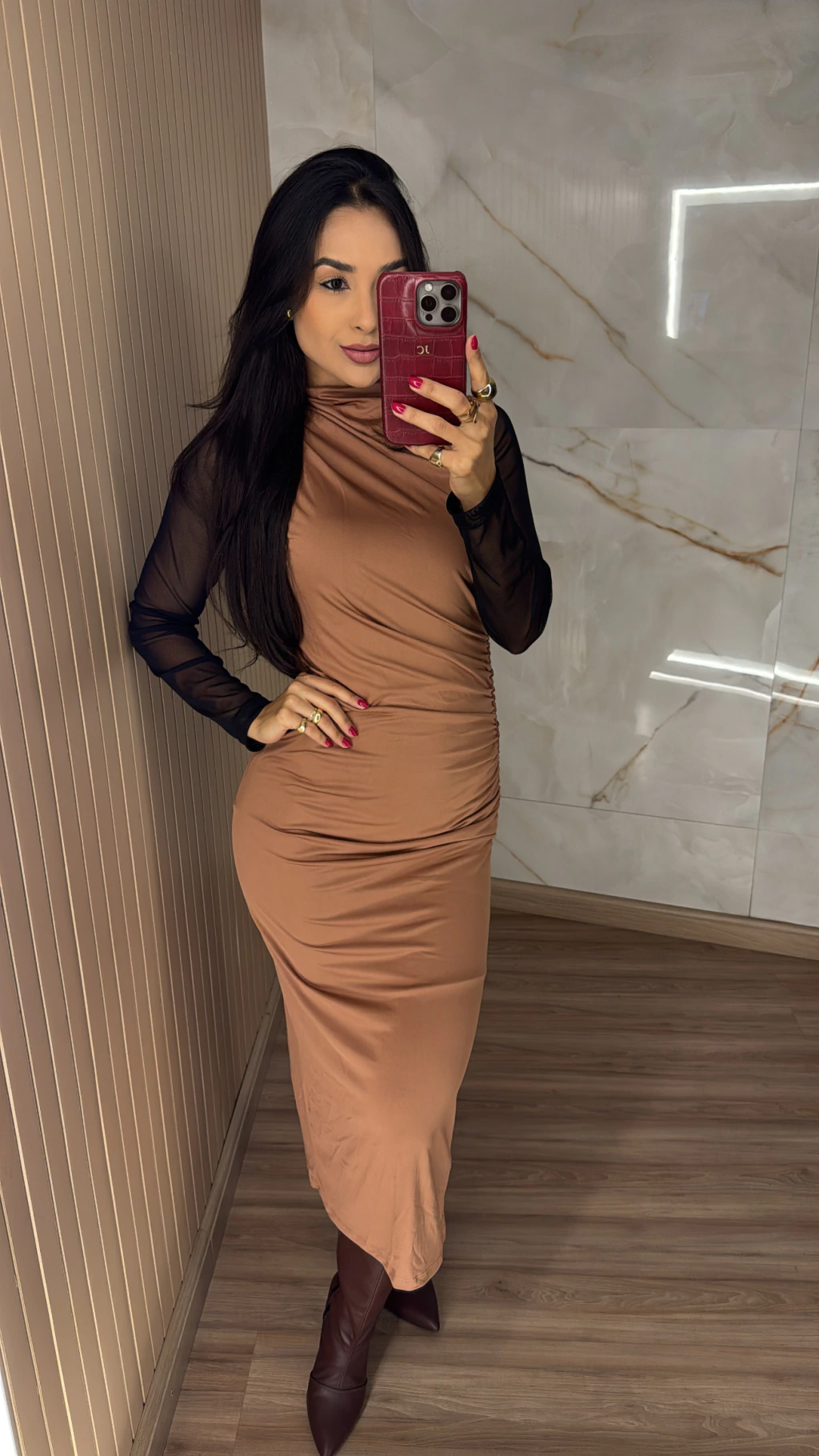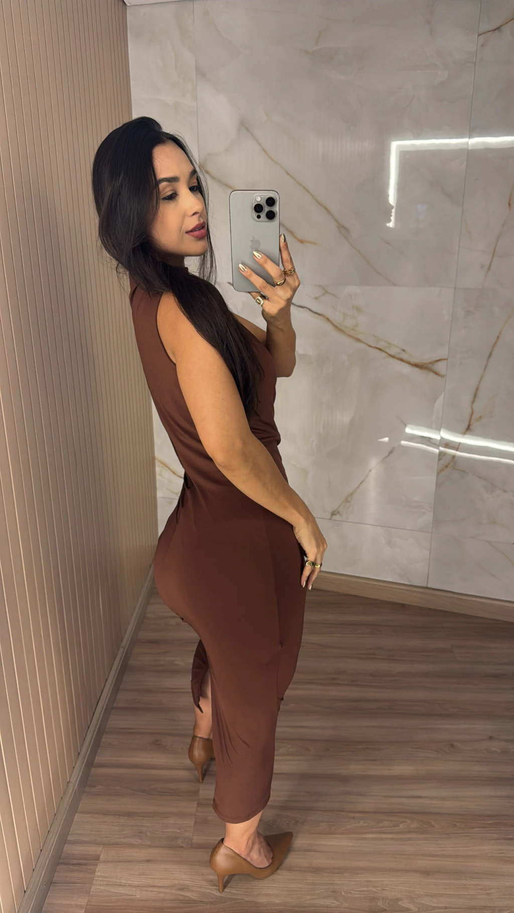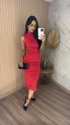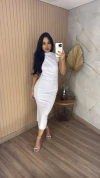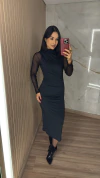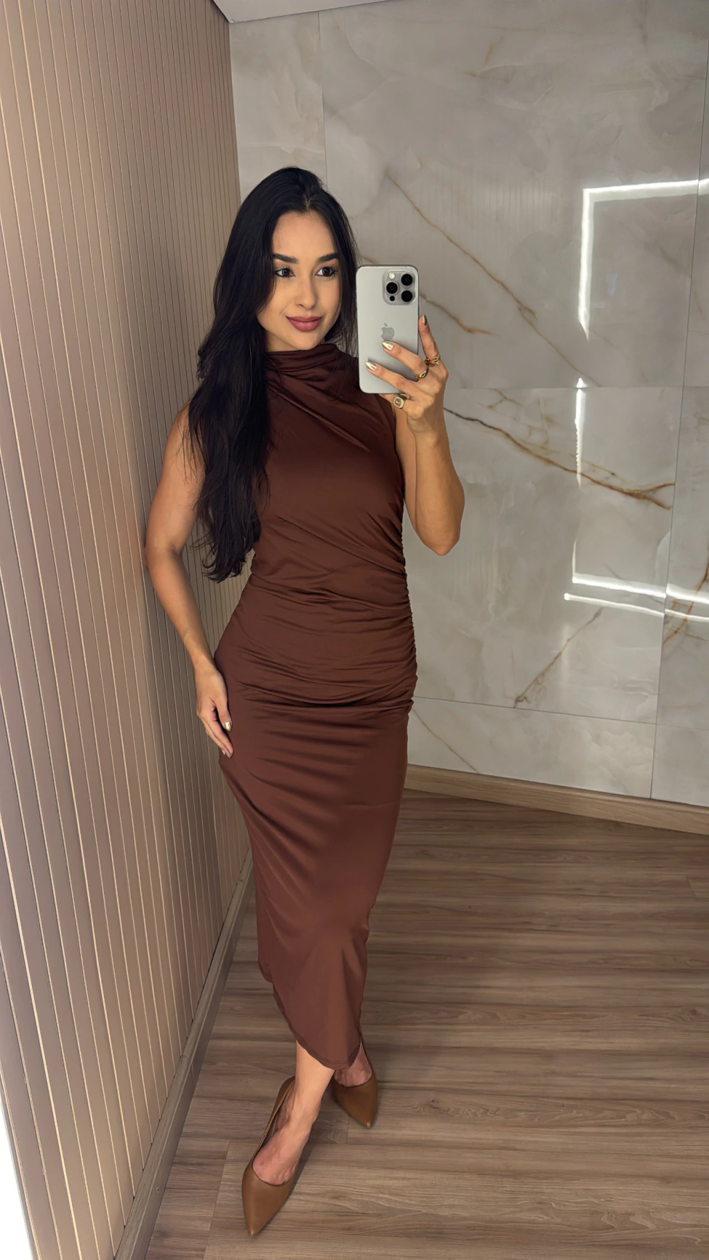Vestido perfeito em modelo longo, sem decote, que carrega presença e elegância.