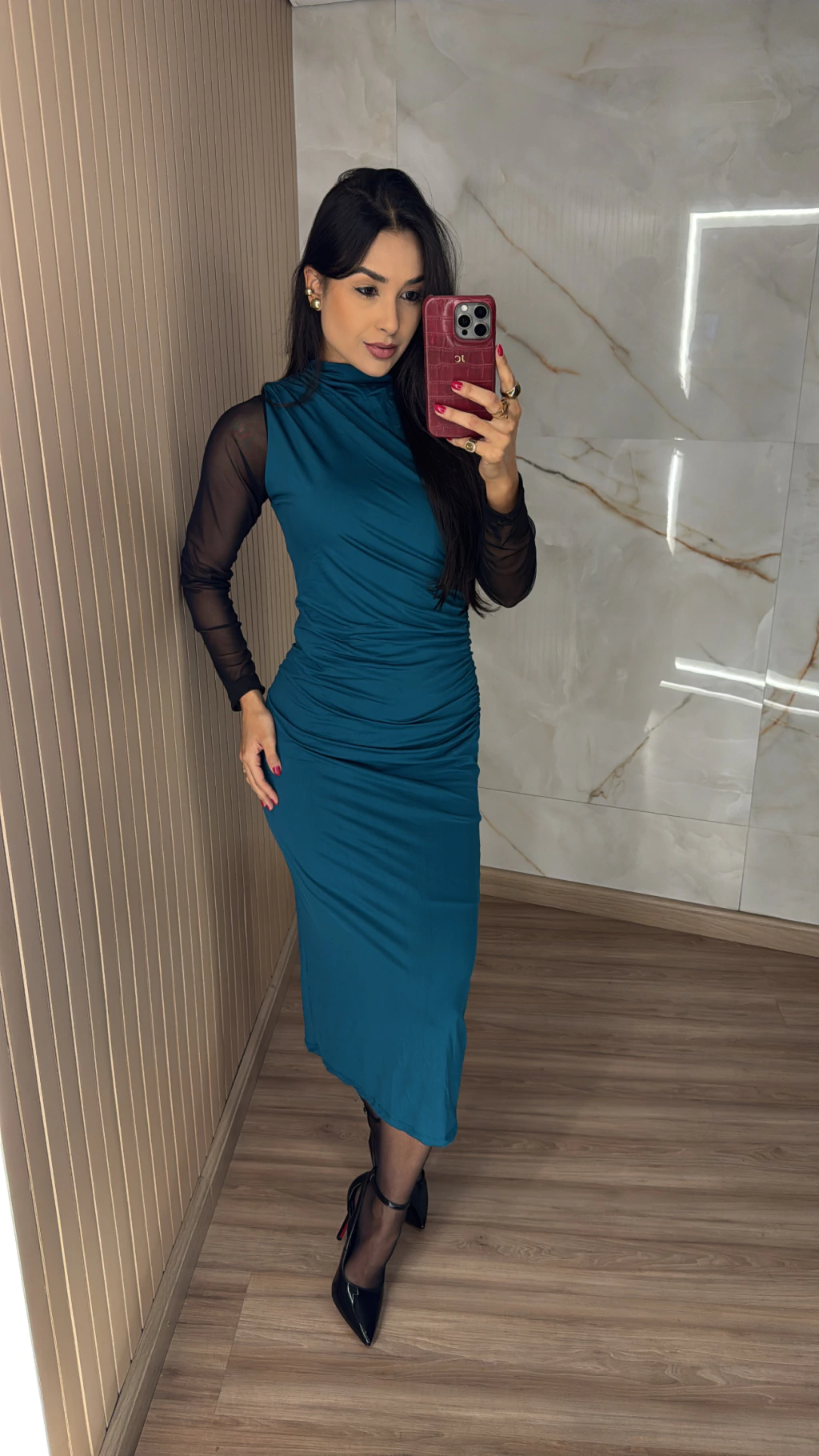 Design Sofisticado: Com gola alta e detalhes drapeados, o vestido confere um visual refinado e contemporâneo, elevando seu estilo.