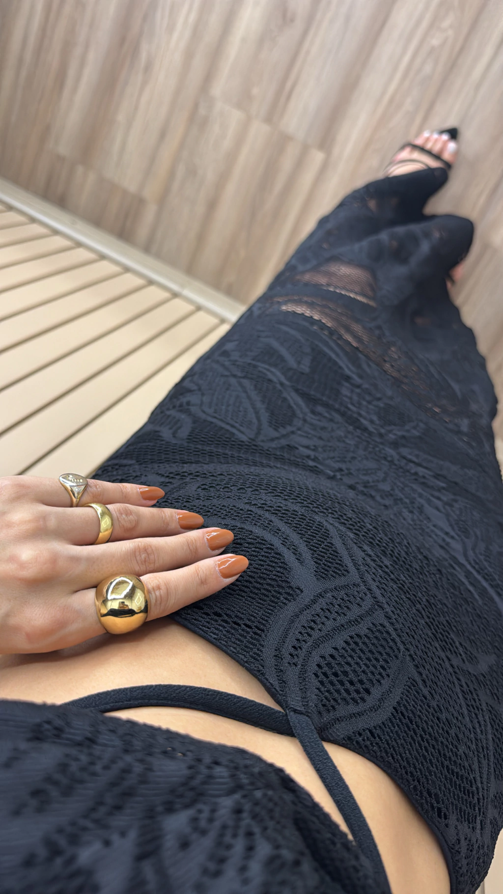 Descrição: Vestido no tecido renda, contém forro, fenda nas duas laterais, a parte de cima é entrelaçada, fita regulável e fechamento com zíper lateral.