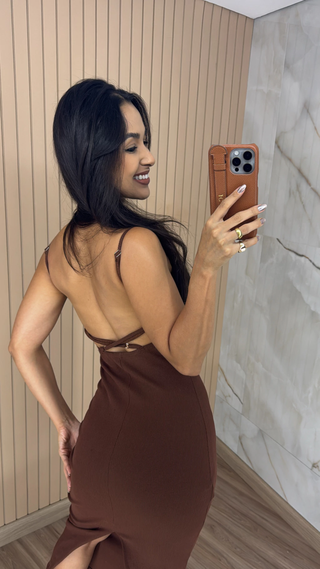 Descrição: O vestido em tecido ribana, é um modelo midi, possui forro na parte do busto, fenda, recortes e alças reguláveis na parte de trás.