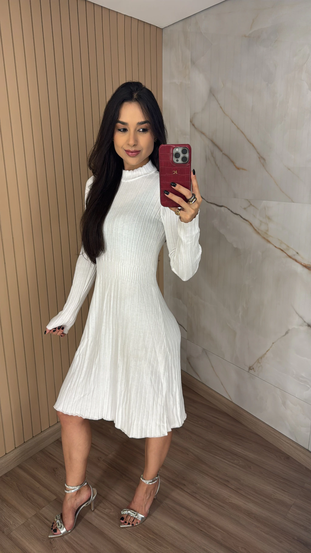 Descrição: O vestido modal possui o comprimento curto, mangas longas e gola alta.