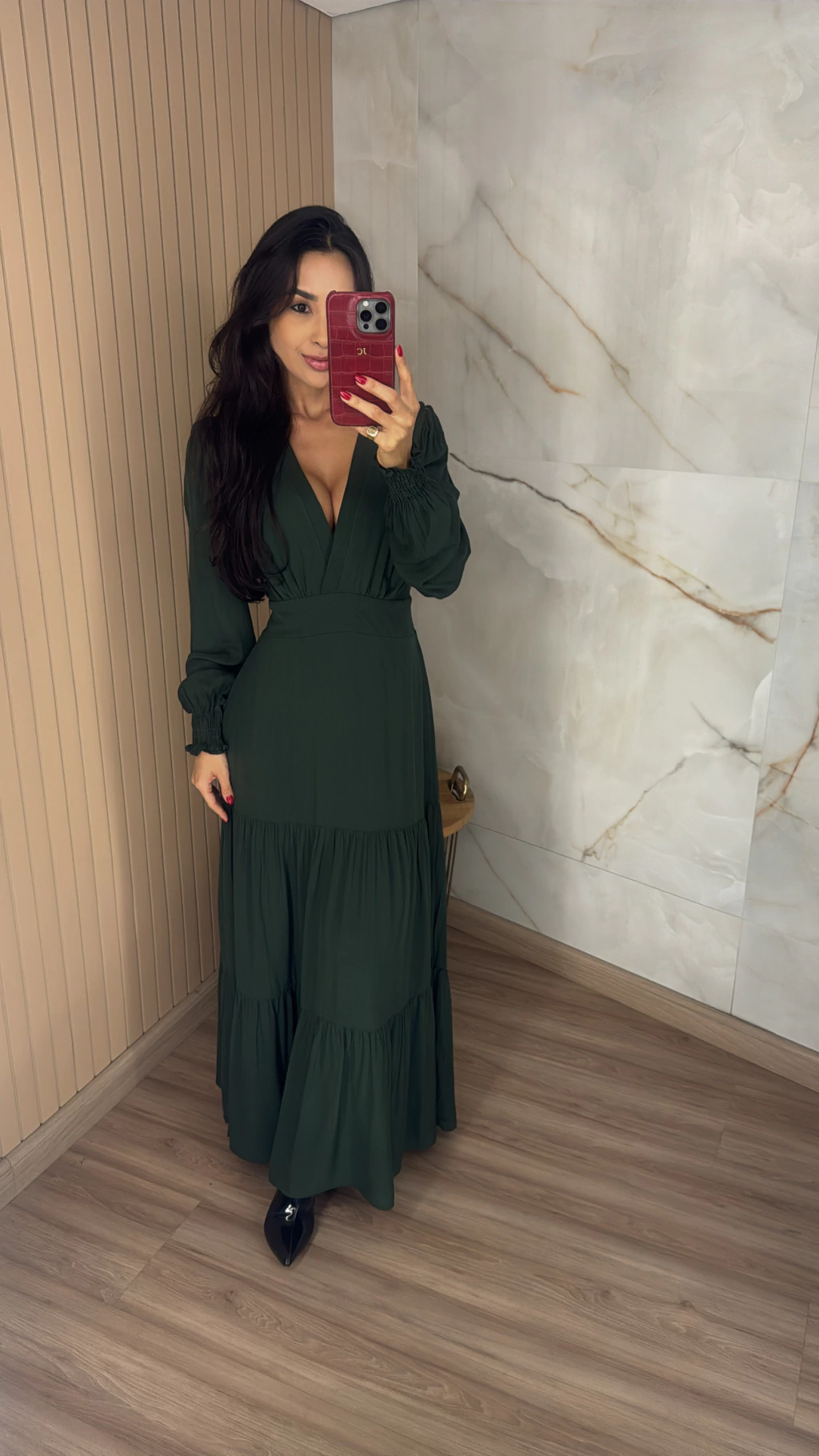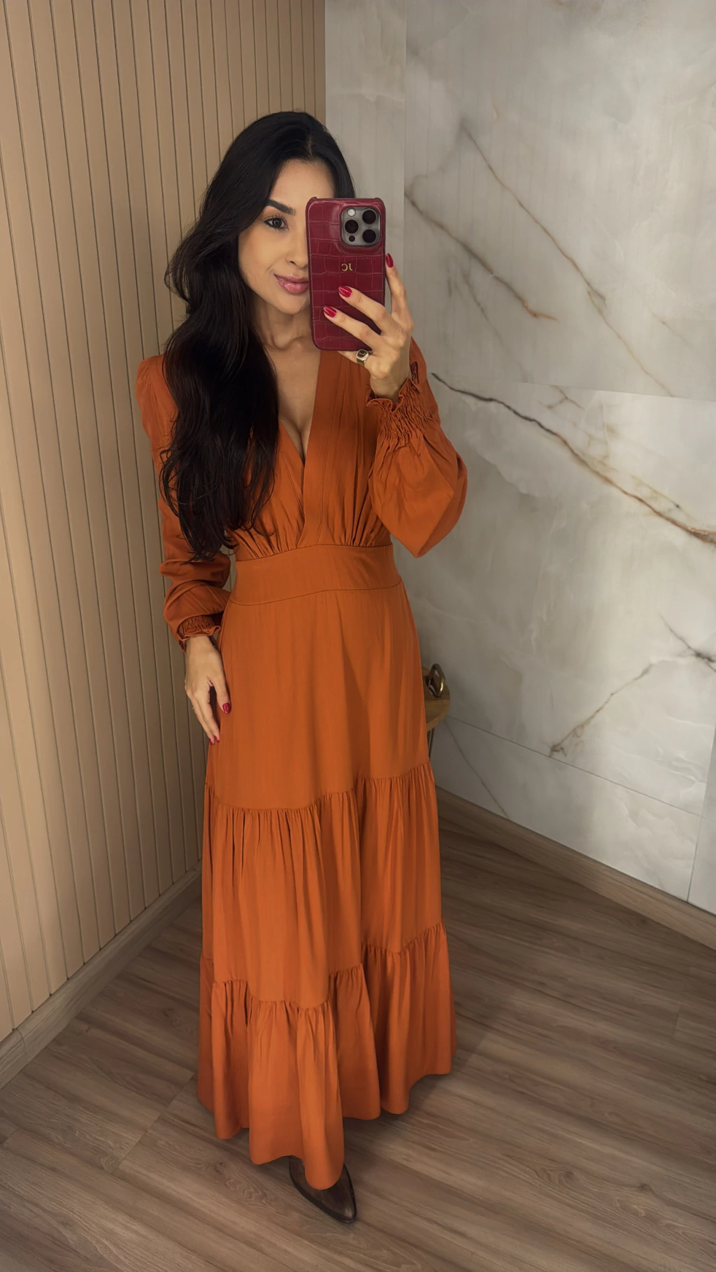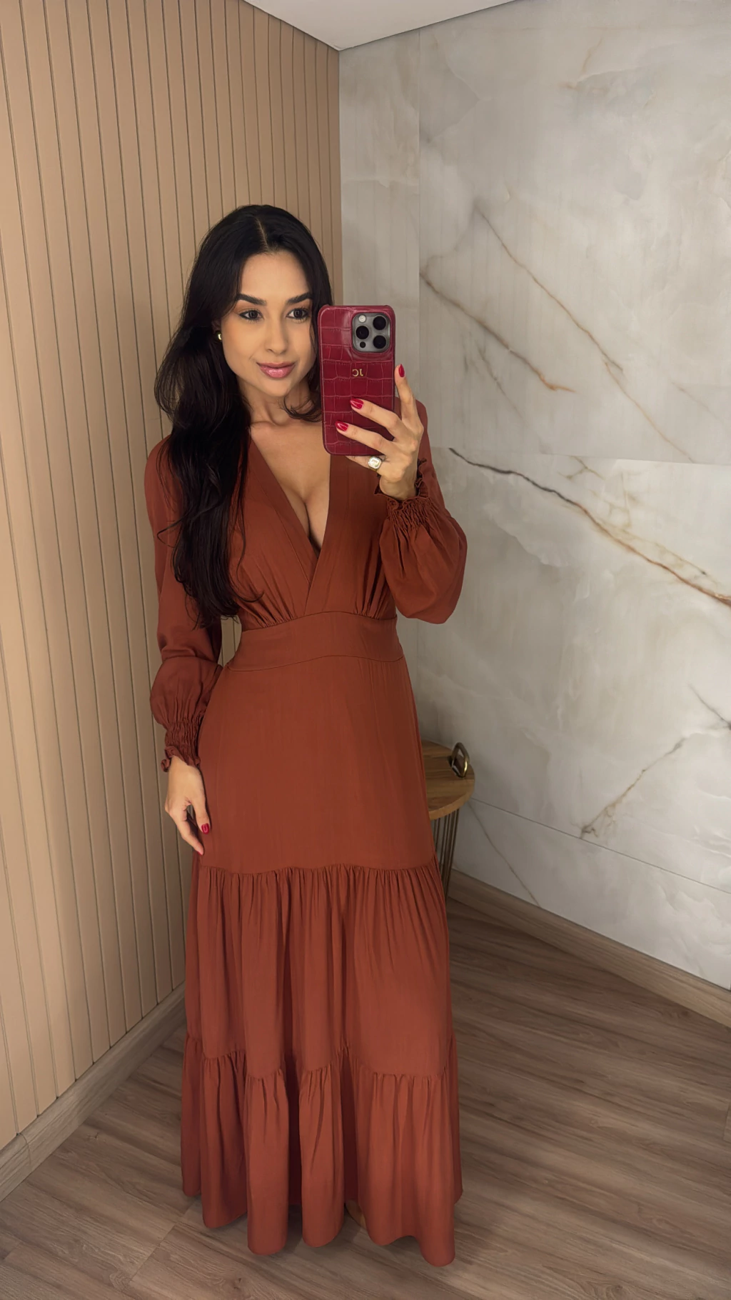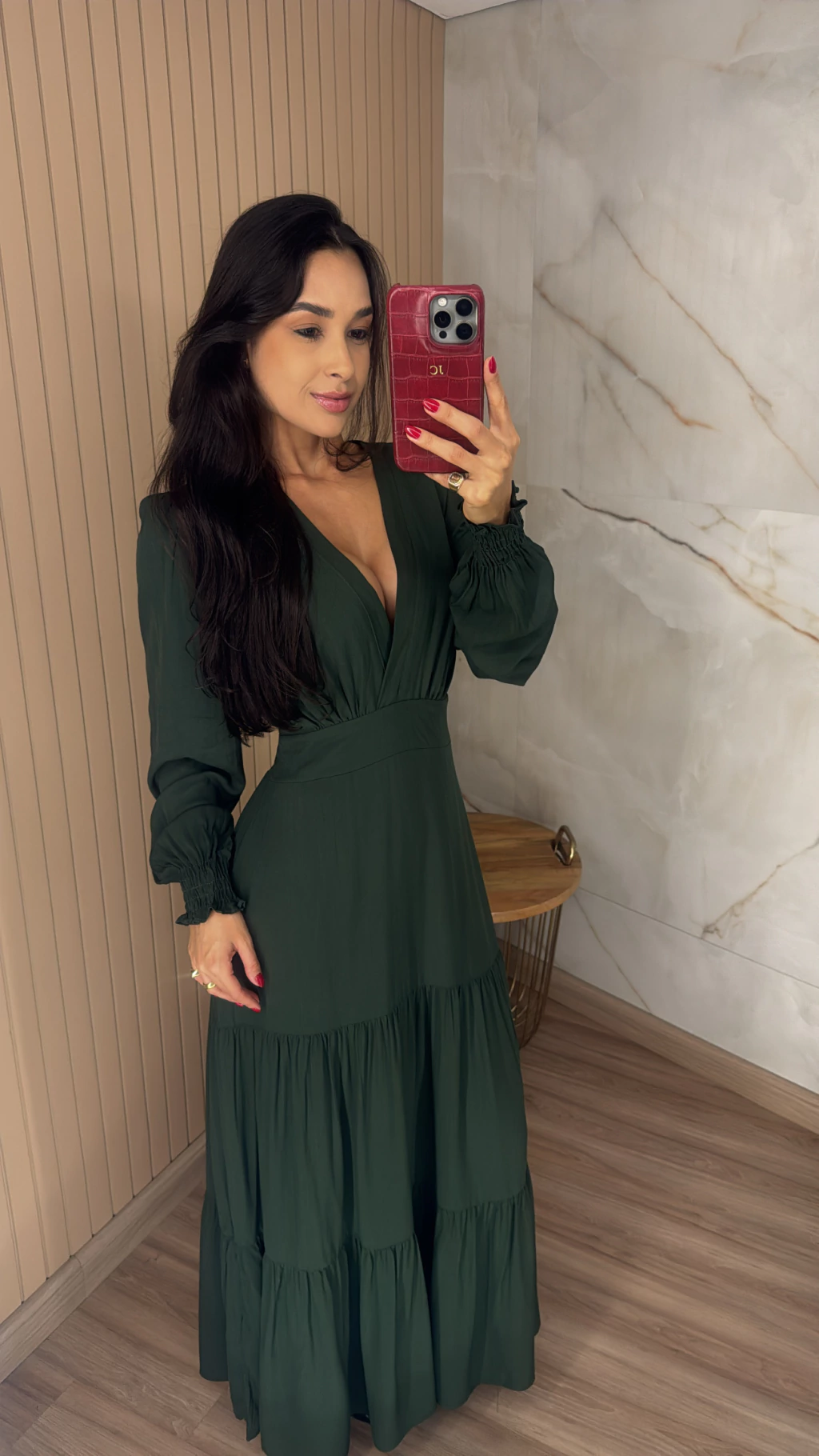 Descrição: o Vestido Viscolinho Manga Longa possui o recorte V no busto, lastex nas costas, comprimento longuete e forro em seu comprimento, detalhe em elástico nos punhos. É a peça que une leveza, estilo e versatilidade. O vestido viscolinho maga longa é aquele item coringa que não pode faltar no seu guarda-roupa. Oferece equilíbrio perfeito entre o caimento impecável e o conforto que você precisa para o dia a dia.