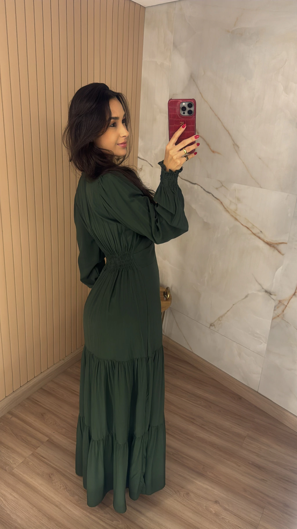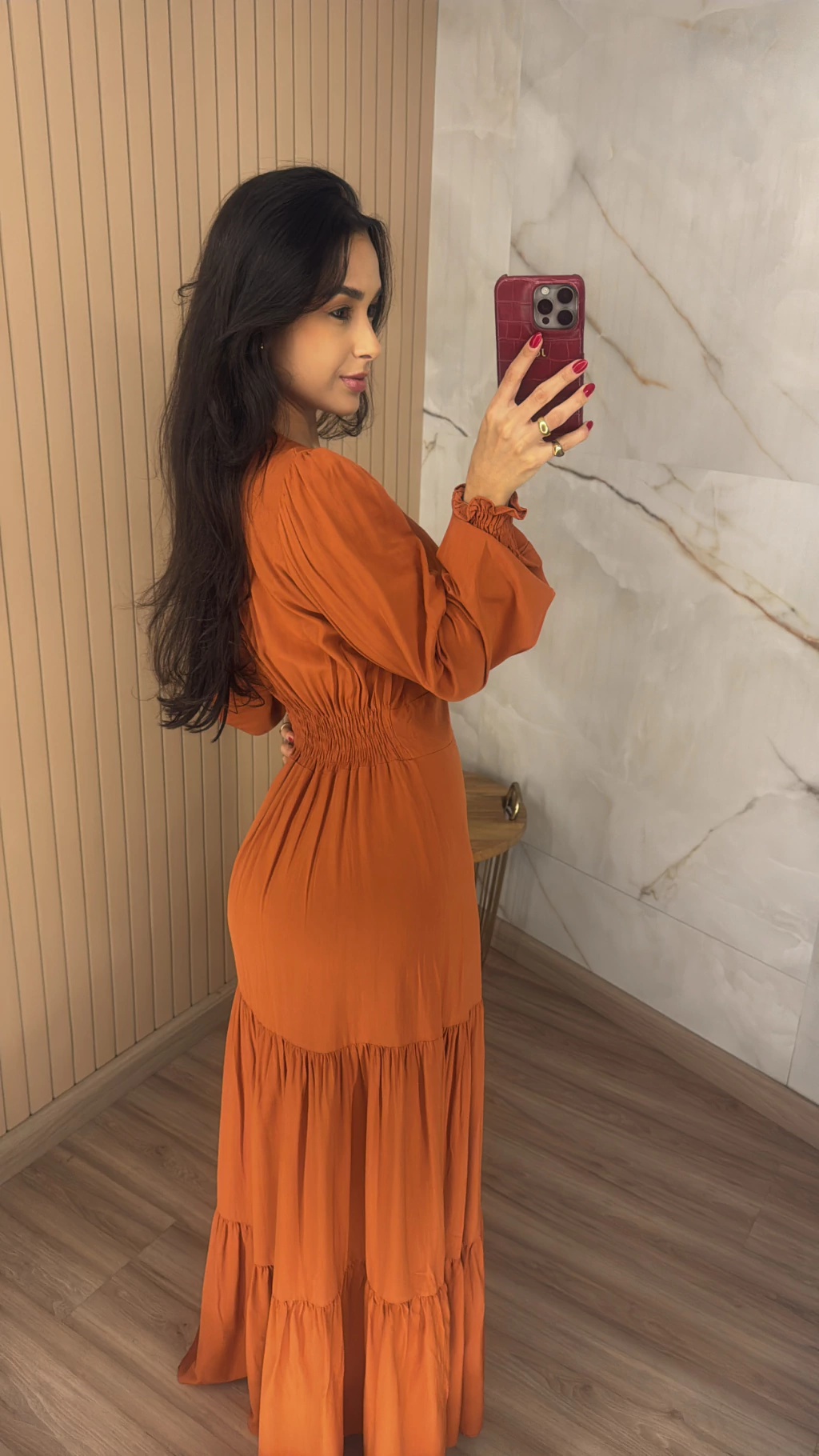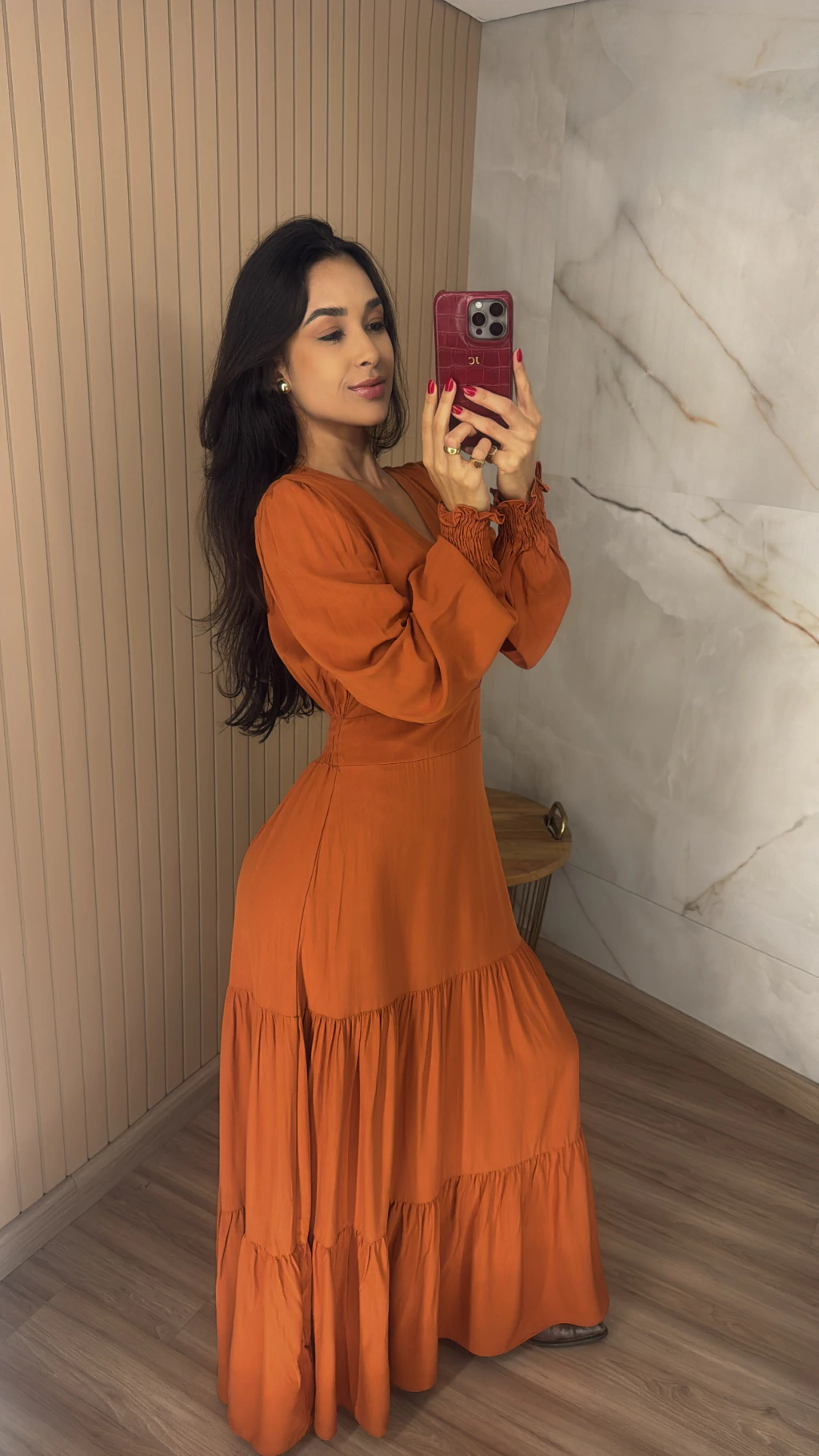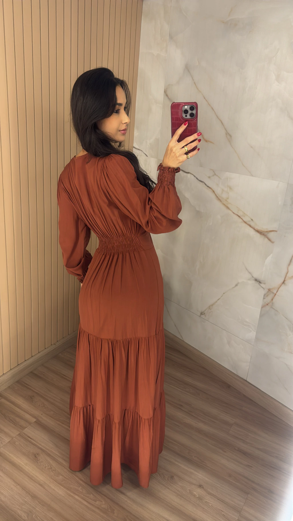 Descrição: o Vestido Viscolinho Manga Longa possui o recorte V no busto, lastex nas costas, comprimento longuete e forro em seu comprimento, detalhe em elástico nos punhos. É a peça que une leveza, estilo e versatilidade. O vestido viscolinho maga longa é aquele item coringa que não pode faltar no seu guarda-roupa. Oferece equilíbrio perfeito entre o caimento impecável e o conforto que você precisa para o dia a dia.
