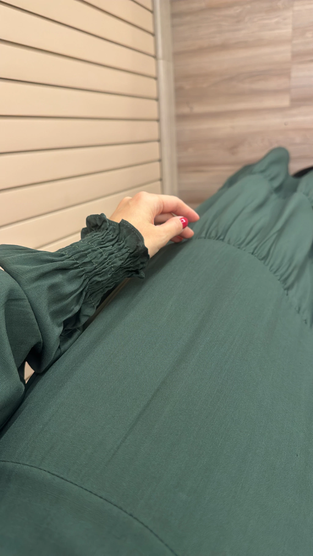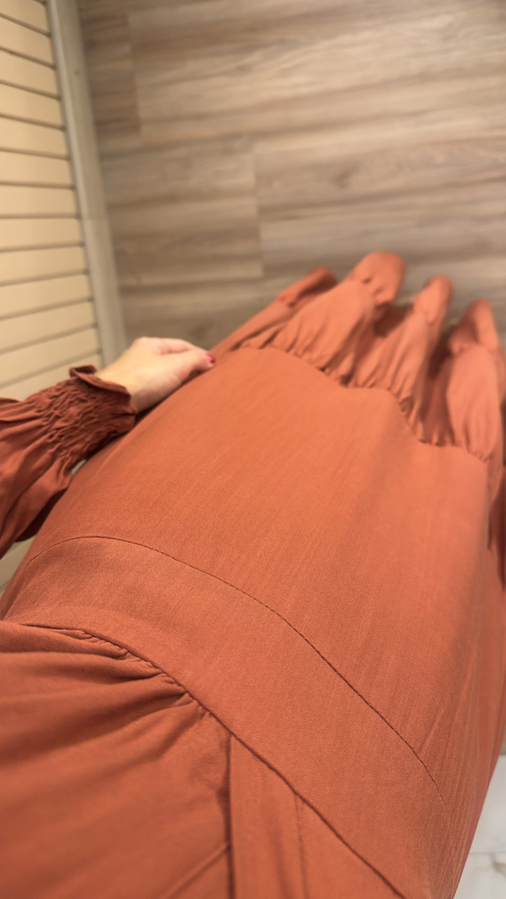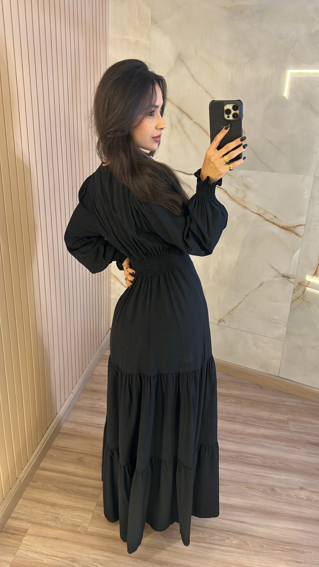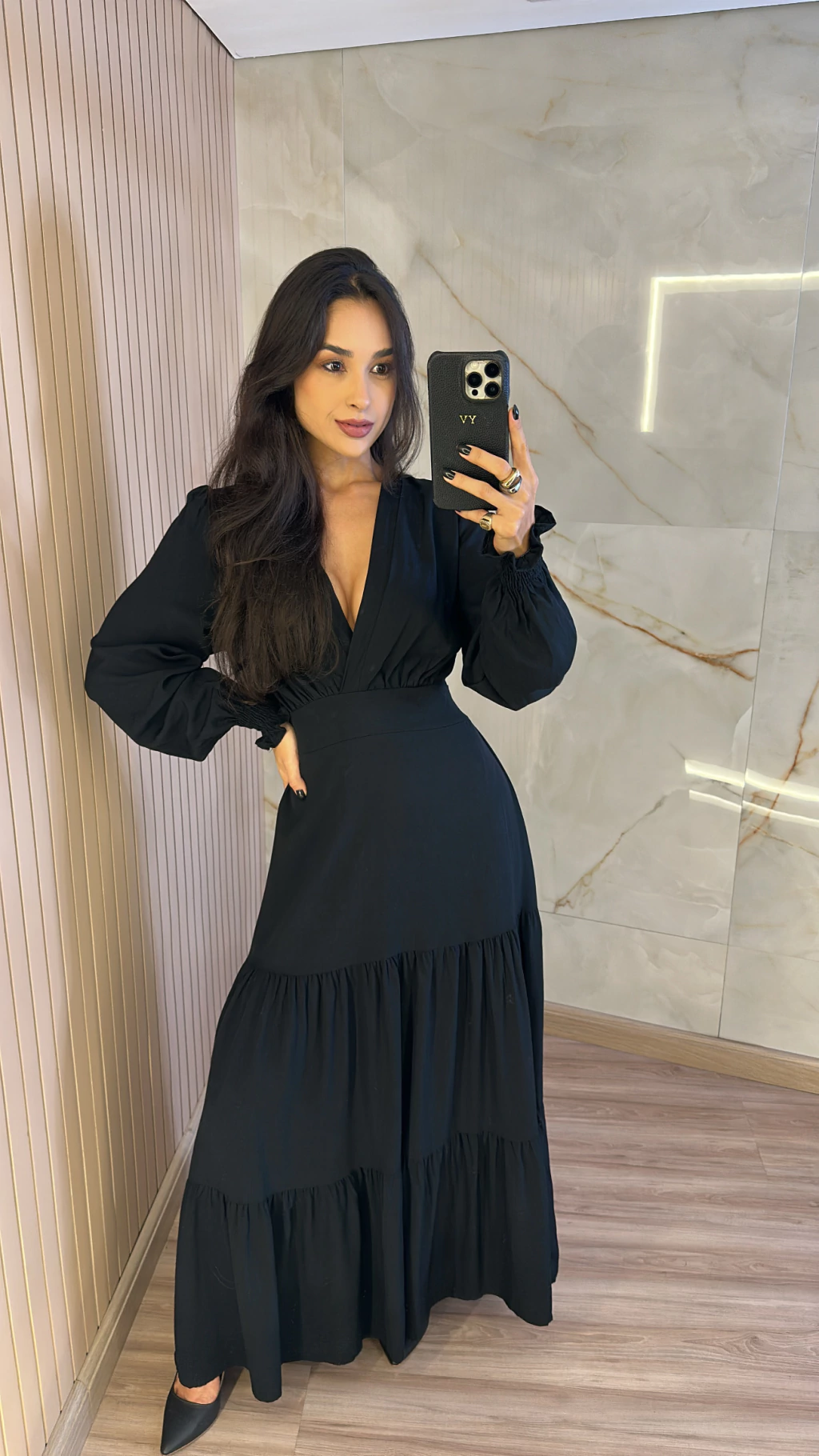 Descrição: o Vestido Viscolinho Manga Longa possui o recorte V no busto, lastex nas costas, comprimento longuete e forro em seu comprimento, detalhe em elástico nos punhos. É a peça que une leveza, estilo e versatilidade. O vestido viscolinho maga longa é aquele item coringa que não pode faltar no seu guarda-roupa. Oferece equilíbrio perfeito entre o caimento impecável e o conforto que você precisa para o dia a dia.