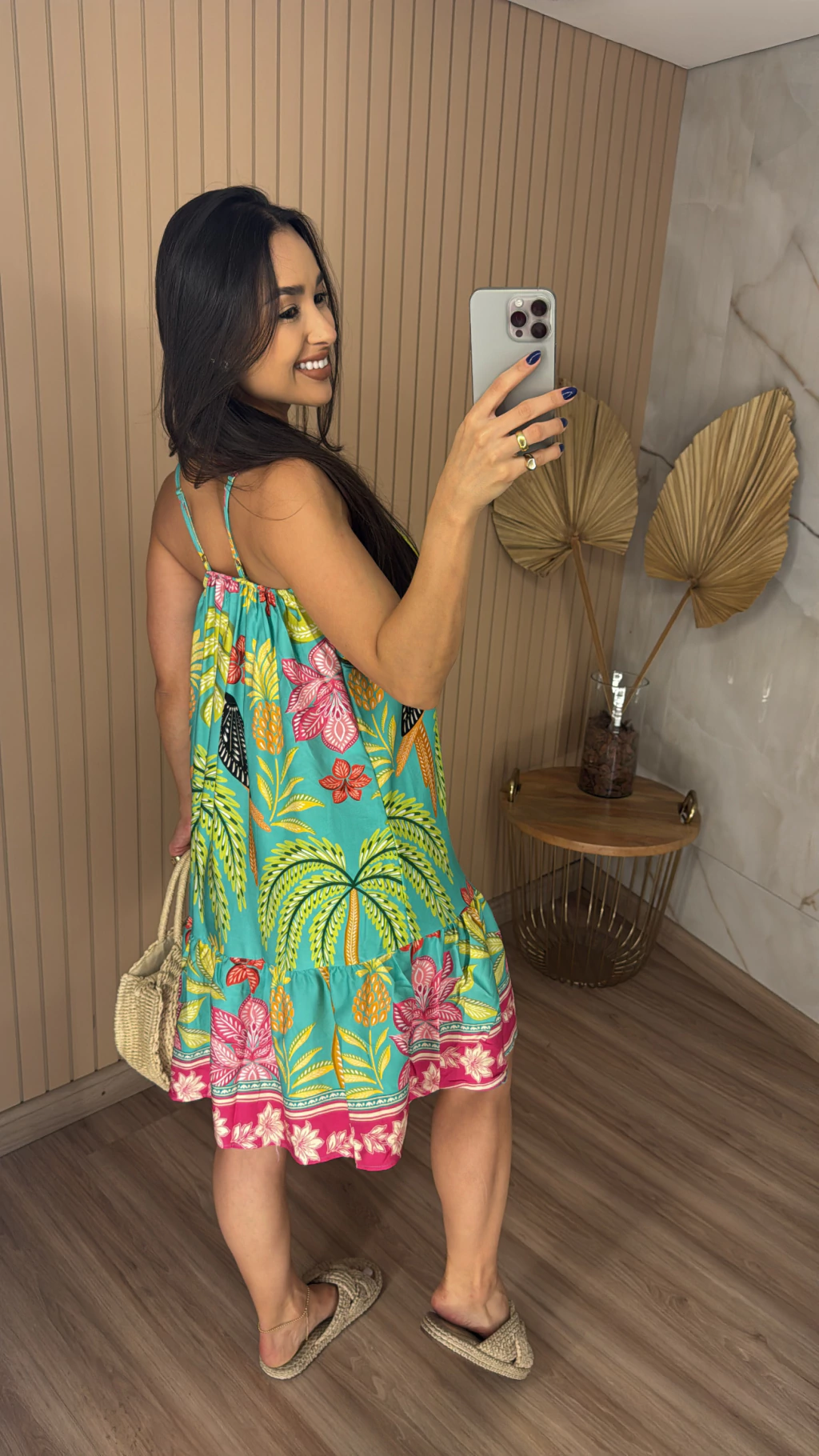 Confeccionado em viscose, o vestido tem um toque suave e um caimento fluido, que acompanha seus movimentos com graça. As alças finas e reguláveis oferecem um ajuste perfeito ao seu corpo, garantindo conforto e segurança.